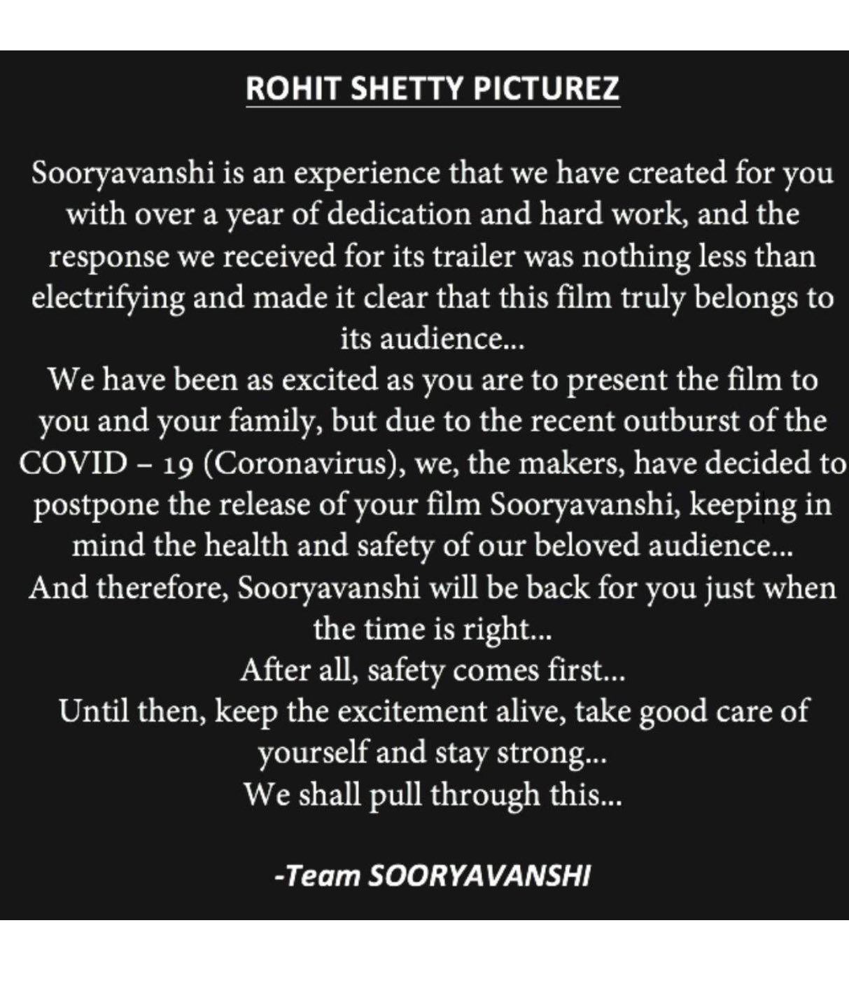 "सूर्यवंशी हा एक अनुभव आहे जो आम्ही तुमच्यासाठी वर्षभर मेहनत घेऊन तयार केलेला आहे आणि चित्रपटाच्या ट्रेलर ला मिळालेला प्रतिसाद हा आम्हाला खूप उत्तेजित करणारा होता, हा चित्रपट खरचं तुम्हा सगळ्या प्रेक्षकांचा आहे, आणि आम्ही तुमच्यासमोर हा चित्रपट सादर करण्यासाठी खूप उत्सुक आहोत पण सध्या कोरोना व्हायरसच्या उद्रेकामुळे आमच्या निर्मात्यांनी प्रेक्षकांच्या आरोग्याचा आणि सुरक्षेचा विचार करून सूर्यवंशी चित्रपटाचे प्रकाशन पुढे ढकलण्याचा निर्णय घेतला आहे."